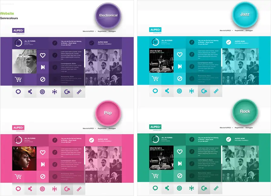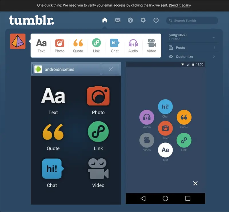 In actual design applications, more comprehensive techniques are often used, such as the overall dominant color, and the same color matching for small-scale layouts. Take Tumblr’s publishing module as an example. Although the page has its own main color, the small module uses function buttons of the same color and different colors, combining hue changes and graphics to express different function points. Many buttons are put together, because of the same color. The module is very stable and unified.
