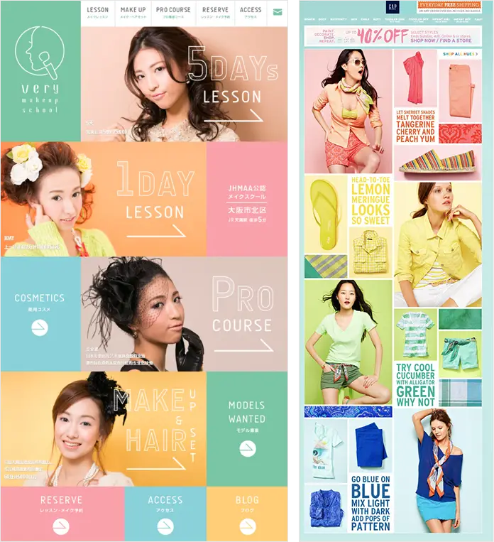 2. Use two colors. First select a color, then select its contrasting color (ctrl+shift+I in Photoshop), and make a small adjustment. The colors throughout the page are bright without being flashy.