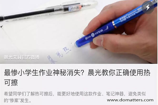 No matter how beautiful the design is, whether the product works well or not is still the root of making the product.You can watch the action of the M&G carefully.Actually it did not do much less which like assessment and answer q&a, popular science and so on.Such as “why there will be holes in the ball pen”, “to understand the color lead classification”, “the binding on the book with what”, “what is the direct liquid type”…Originally these usually do not know the cold knowledge is so interesting.As a result, the degree of favorable impression of the brand is also promoted imperceptibly.And in response to relevant hot issues, dawn is not ambiguous.Some time ago, the news that the homework of primary school students disappeared overnight came out.